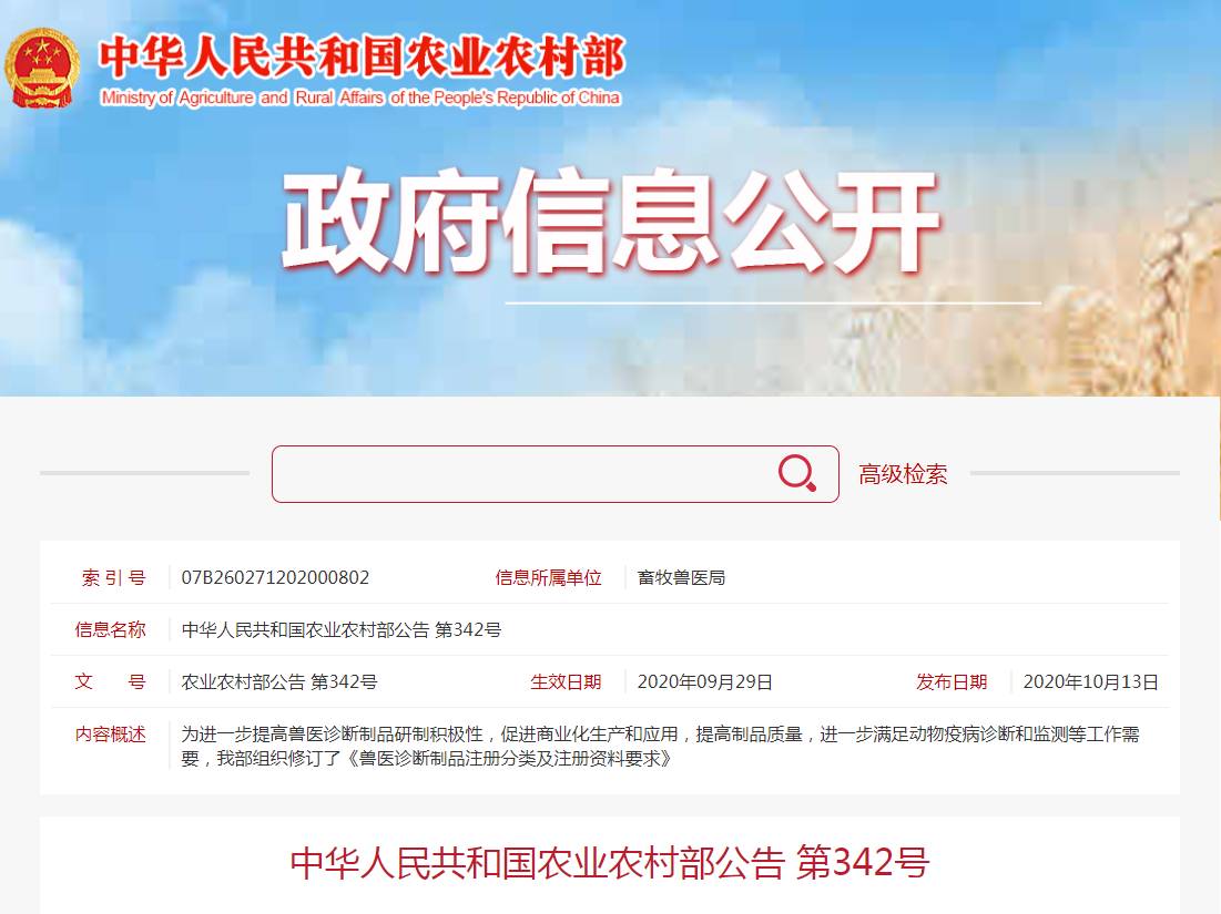 为进一步提高兽医诊断制品研制积极性,促进商业化生产和应用,提高制品质量,进一步满足动物疫病诊断和监测等工作需要,我部组织修订了《兽医诊断制品注册分类及注册资料要求》,现予发布,自2020年10月15日起施行,并就有关事项公告如下。